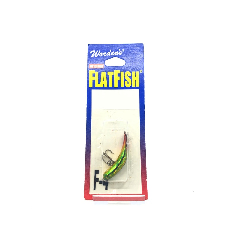 Worden's Flatfish F4 Metallic Gold Green Pirate Color New Old Stock. Iconic lure here in a color that is usually sold out everywhere else. About 1 1/2" long and in new condition. The Flatfish has a multi-species design that offers unique action that will a