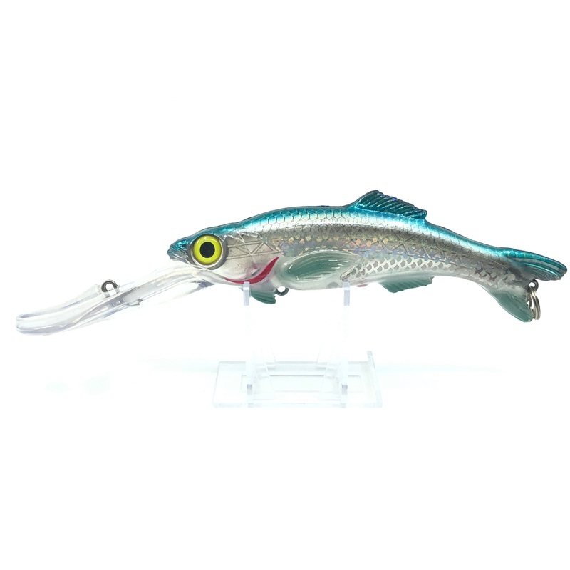 Worden’s Sea Tiger 4045 HBH Blue Herring Salesmen Sample. Worden’s flagship Sea-Tow wobbler lure. This almost 7″ saltwater or large freshwater game fish bait has a maximum diving depth of 24′ regardless of the speed. This lure provide plenty of action, appeal and sound thanks to its hyper realistic design and the large beads inside of the lure.The sample model unfortunately comes with a color code underneath the lip and has no hooks.