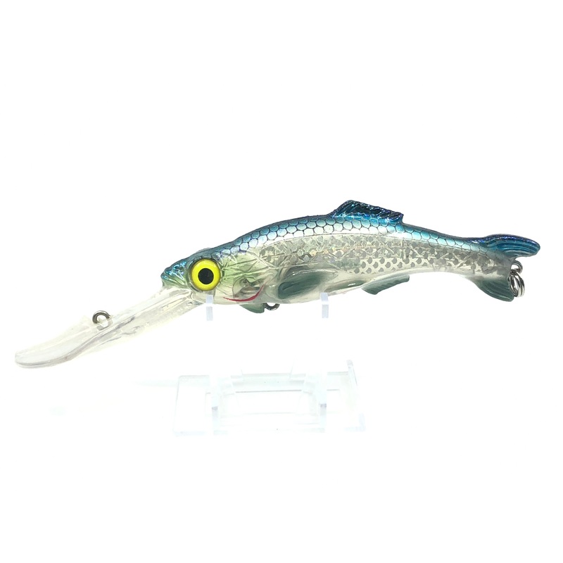 Worden’s Sea Tiger 4050 HBH Herring Blue Salesmen Sample. Worden’s flagship Sea-Tow wobbler lure. This almost 9″ saltwater or large freshwater game fish bait has a maximum diving depth of 30′ regardless of the speed. This lure provides plenty of action, appeal and sound thanks to its hyper realistic design and the large bead inside of the lure.The sample model unfortunately comes with a color code underneath the lip and has no hooks.