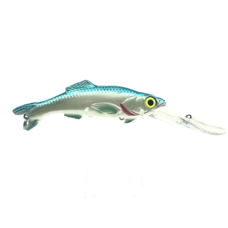 Worden’s Sea Tiger 4050 HBP Herring Blue Pearl Salesmen Sample. Worden’s flagship Sea-Tow wobbler lure. This almost 9″ saltwater or large freshwater game fish bait has a maximum diving depth of 30′ regardless of the speed. This lure provides plenty of action, appeal and sound thanks to its hyper realistic design and the large bead inside of the lure.The sample model unfortunately comes with a color code underneath the lip and has no hooks.