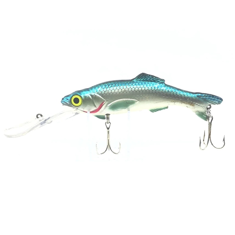 Worden’s Sea Tiger 4050 HBP Herring Blue Pearl Salesmen Sample. Worden’s flagship Sea-Tow wobbler lure. This almost 9″ saltwater or large freshwater game fish bait has a maximum diving depth of 30′ regardless of the speed. This lure provides plenty of action, appeal and sound thanks to its hyper realistic design and the large bead inside of the lure.The sample model unfortunately comes with a color code underneath the lip and has no hooks.