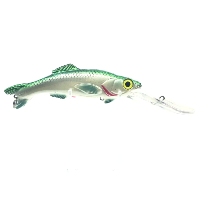 Worden’s Sea Tiger 4050 HGP Green Herring Salesmen Sample. Worden’s flagship Sea-Tow wobbler lure. This almost 9″ saltwater or large freshwater game fish bait has a maximum diving depth of 30′ regardless of the speed. This lure provides plenty of action, appeal and sound thanks to its hyper realistic design and the large beads inside of the lure.The sample model unfortunately comes with a color code underneath the lip and has no hooks.