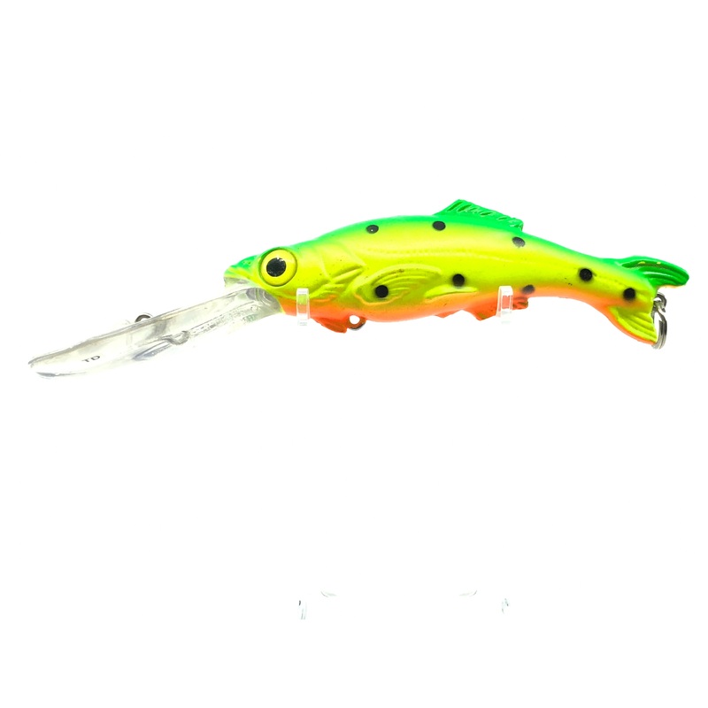 Worden’s Sea Tiger TD Firetiger Salesmen Sample. Worden’s flagship Sea-Tow wobbler lure. This 7″ saltwater or large freshwater game fish bait has a maximum diving depth of 24′ regardless of the speed. This lure provide plenty of action, appeal and sound thanks to its hyper realistic design and the large beads inside of the lure.The sample models come with a color code underneath the lip and has no hooks.